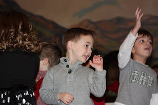 Here he is when they first went on the stage and lined up. He was holding tightly to Miss Stacy's hand before they came in and while they were going up. I think he was nervous. His eyes give it away in this picture--he's seeing all the people out there!